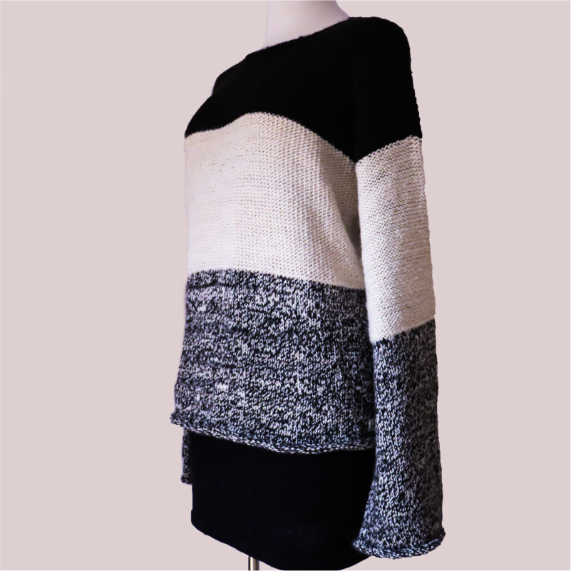 Chompa jersey cuello “O” mod oberside manga ancha, Franjas muy pronunciados puntos combinados material y color e hilado 100% fibra de alpaca biodegradable hilado titulo1/9.